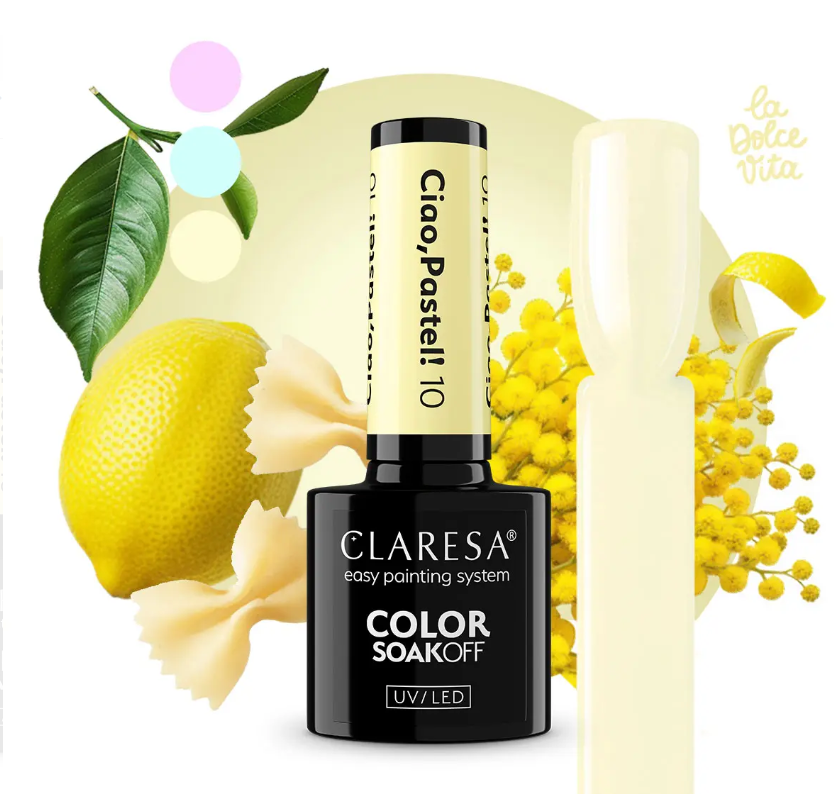 CLARESA Ciao, Pastel! 10 je jemný pastelový svetložltý gél lak s krémovým mliečnym podtónom. Tento svieži odtieň pripomína prvé jarné lúče slnka a dodáva manikúre ľahký, optimistický a elegantný vzhľad.