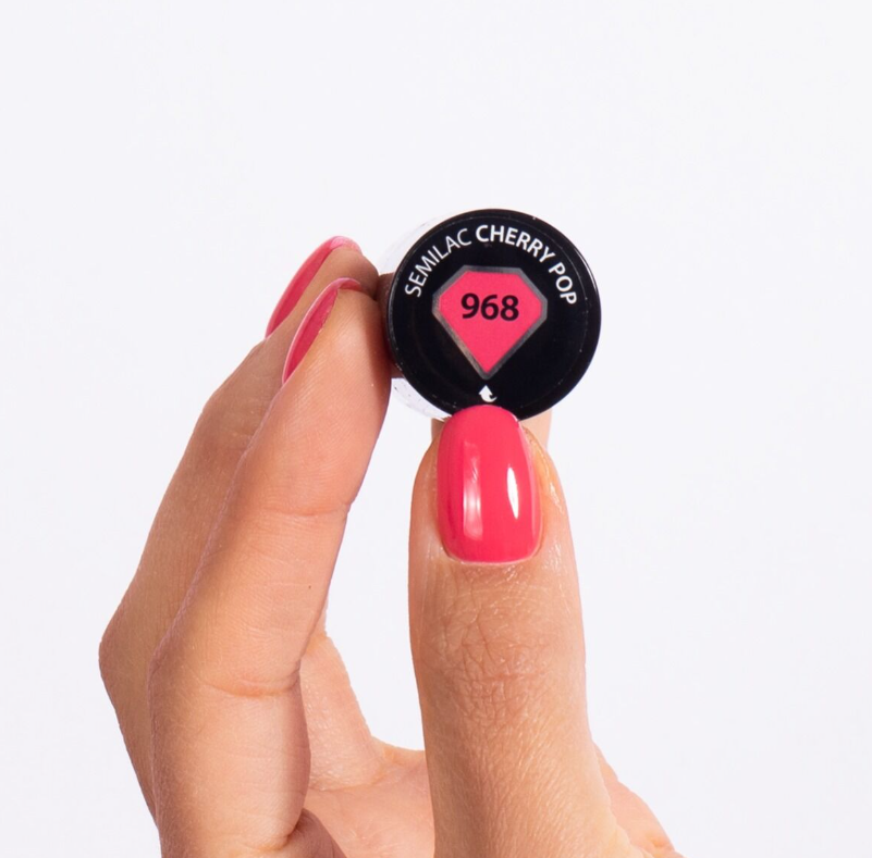 Na pripravený necht naneste tenkú vrstvu obľúbenej Semilac bázy a vytvrďte v UV/LED lampe. Následne aplikujte tenkú vrstvu farby Semilac 968 Cherry Pop a vytvrďte. Pre intenzívnejší efekt môžete aplikovať druhú vrstvu farby. Manikúru zakončite aplikáciou vrchného Semilac Top a vytvrďte v lampe.
