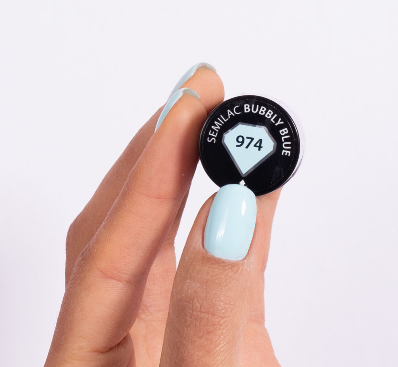 Semilac 974 Bubbly Blue je ideálny pre jemnú pastelovú manikúru, ktorá pôsobí sviežo, elegantne a moderne.